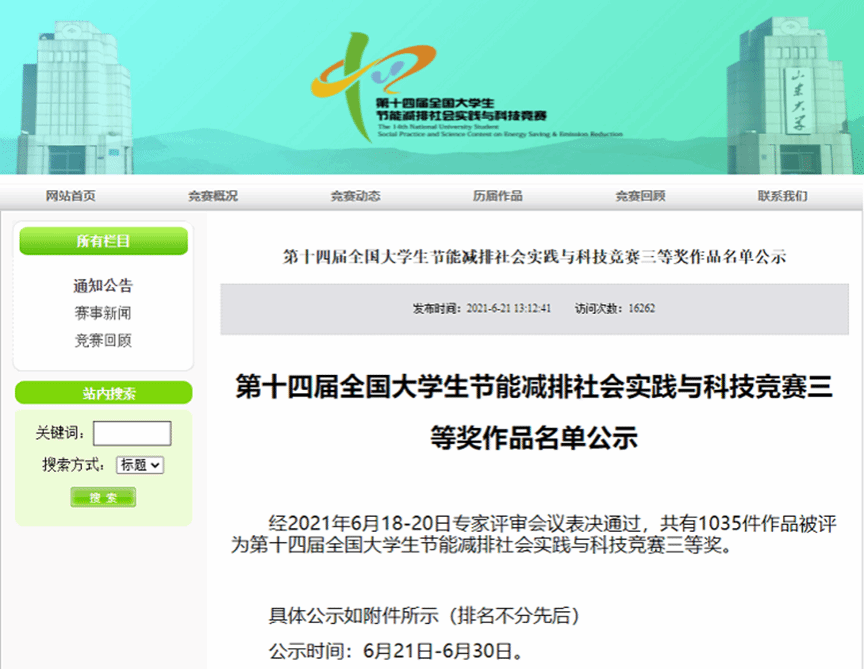 6月21日-30日,全国大学生节能减排社会实践与科技竞赛委员会秘书处对第十四届全国大学生节能减排社会实践与科技竞赛三等奖作品进行了公示。