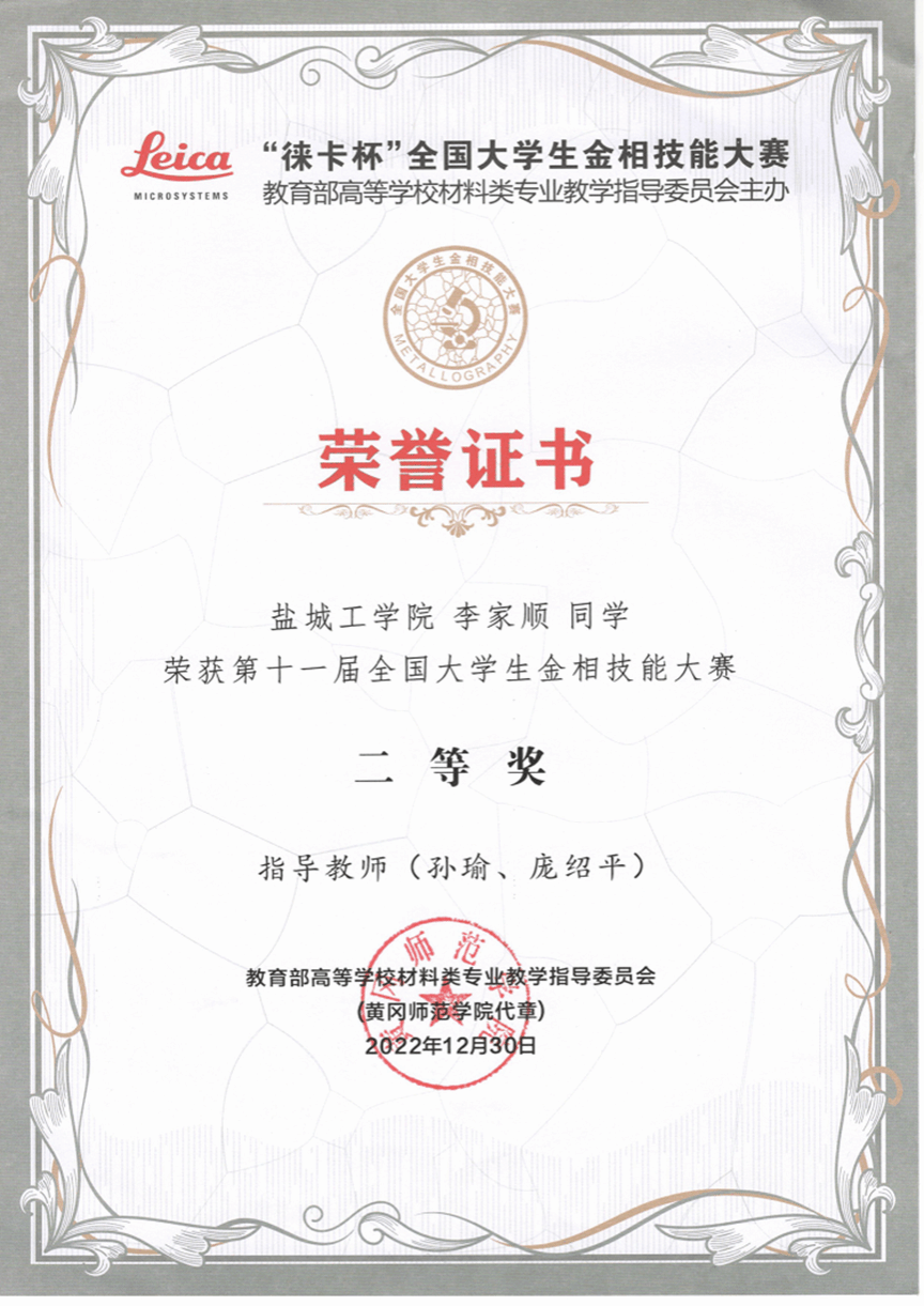 近日,第十一届全国大学生金相技能大赛结果公布,我院参赛队伍由孙瑜、庞绍平、宋娟三位老师指导,分别获得一等奖1项(学生:杨馨悦),二等奖2项(学生:李家顺、罗楷),三等奖1项(学生:李启帆)。至此,我院学生连续八年获得该赛事一等奖。