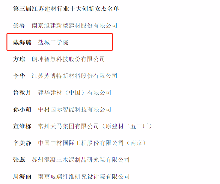 为贯彻党的二十大精神,庆祝三八国际妇女节,树立行业女性典范,展示杰出女性为建材行业高质量发展做出的重要贡献和奋发有为的精神风貌,省建材行业协会连续三年组织了江苏建材行业十大创新女杰推荐评选活动。经会员单位推荐、省协会及专家评审,必赢bwin线路检测中心学院教师郭伟、田亮、戴海璐等3名女教师,分别连续三届荣获“江苏建材行业十大创新女杰”称号。