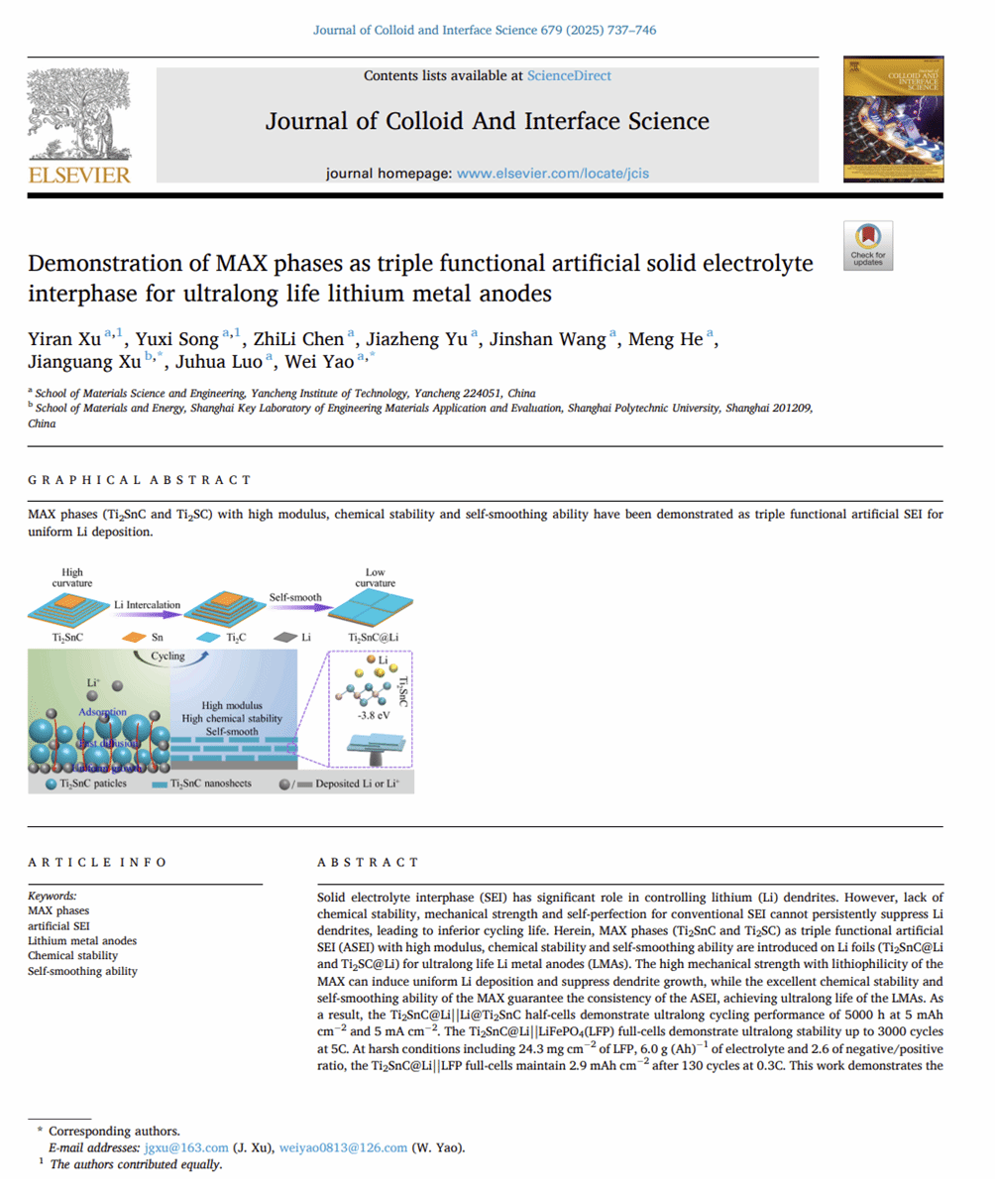 近日,必赢bwin线路检测中心研究生徐毅然在姚为教授的指导下,在《Journal of Colloid and Interface Science》(中科院一区Top,影响因子:9.4)上以第一作者身份,盐城工学院为第一单位发表了题为“Demonstration of MAX Phases as Triple Functional Artificial Solid Electrolyte Interphase for Ultralong Life Lithium Metal Anodes”的研究论文(J. Colloid Interf. Sci. 2025, 679, 737-746),文章链接:https://doi.org/10.1016/j.jcis.2024.10.019。该论文是我院研究生高质量培养的又一次重要体现。