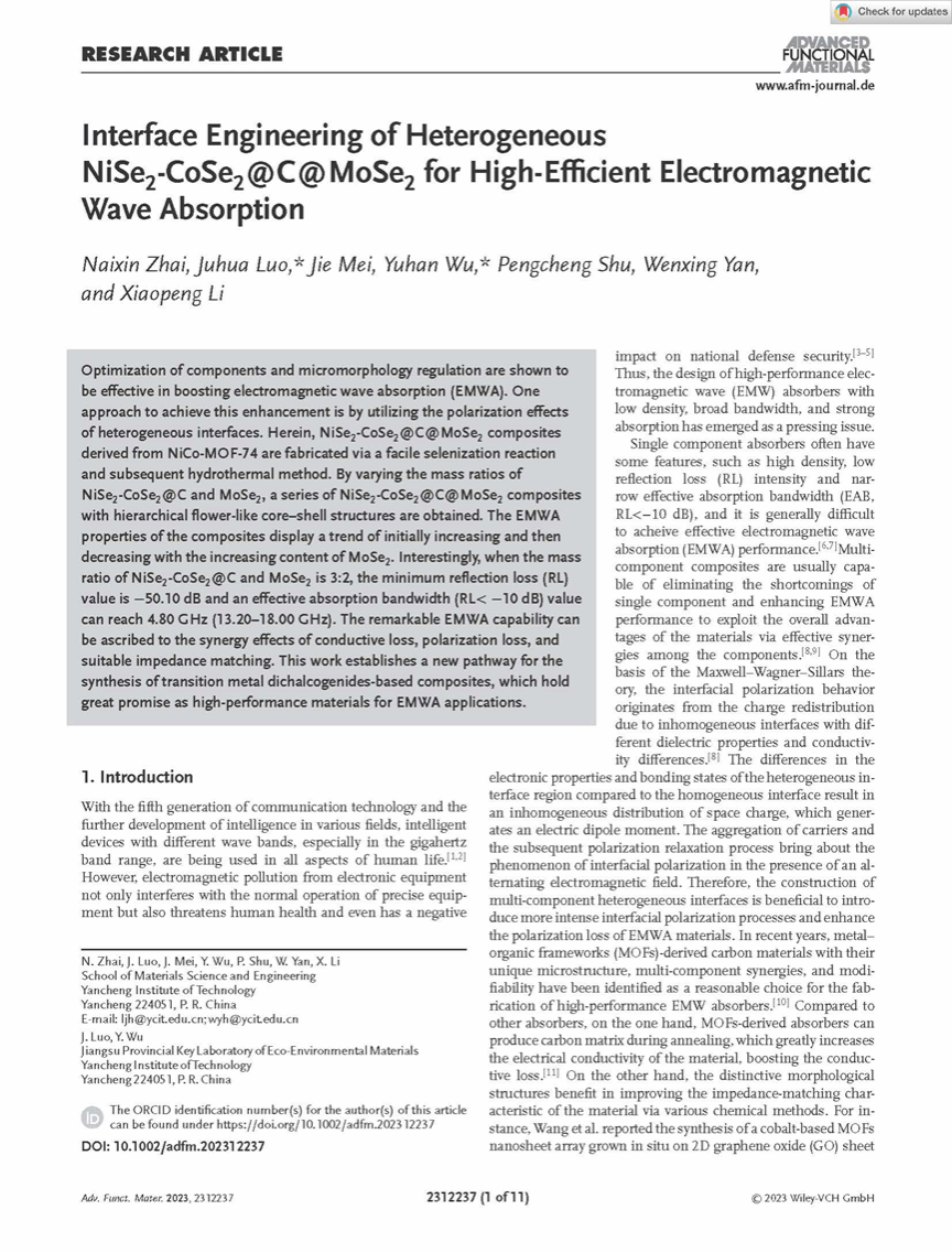 近日,我校必赢bwin线路检测中心罗驹华教授课题组在材料领域顶级期刊Advanced Functional Materials上发表题为“Interface Engineering of Heterogeneous NiSe2-CoSe2@C@MoSe2 for High-Efficient Electromagnetic Wave Absorption”的研究成果(https://doi.org/10.1002/adfm.202312237)。这是我校研究生首次为第一作者,盐城工学院为唯一通讯单位在此期刊发表研究论文。Advanced Functional Materials由Wiley出版,报道材料科学各个方面的突破性研究,包括纳米技术、化学、物理和生物,是国际公认的材料领域顶级专业期刊,在业界享有极高的声誉。2023年最新影响因子为19.924。