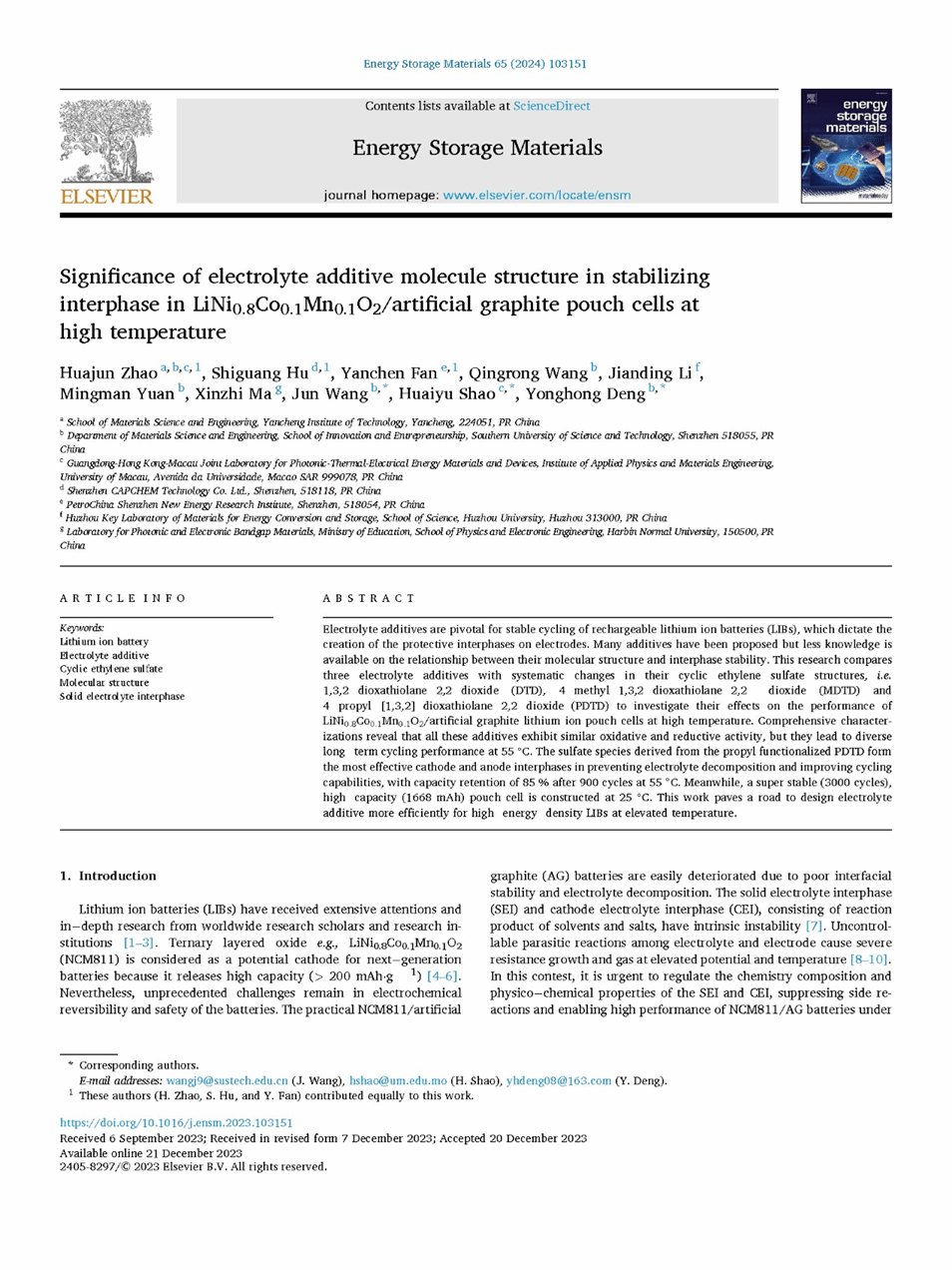 近日,我校必赢bwin线路检测中心赵华军博士在国际材料学科顶级期刊Energy Storage Materials上发表题为“Significance of Electrolyte Additive Molecule Structure in Stabilizing Interphase in LiNi0.8Co0.1Mn0.1O2/Artificial Graphite Pouch Cells at High Temperature”的研究成果,论文链接https://doi.org/10.1016/j.ensm.2023.103151。Energy Storage Materials发表储能材料等领域的重大新发现,涉及材料的合成、制备、结构、性能和技术应用,以及它们在电化学、化学、电学、热学、磁性和机械能存储装置中的应用,是国际公认的材料领域顶级专业期刊,在业界享有极高的声誉。最新影响因子为20.4。
