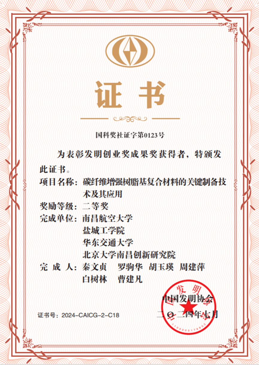 近日,中国发明协会颁发了2024年度发明创业奖证书,我校作为第二完成单位、必赢bwin线路检测中心罗驹华教授作为第二完成人的《碳纤维增强树脂基复合材料的关键制备技术及其应用》荣获发明创业奖成果奖二等奖。